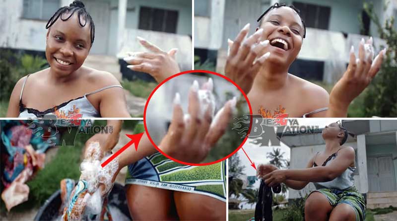Tweaaaaaaa! Sister Aunty Obaa Yemi paaaaa, where in Africa can you find a local/village African girl with such installed fake plastic/rubber nails washing such ‘African Clothes’— and I hope you know what I mean by ‘African clothes’???