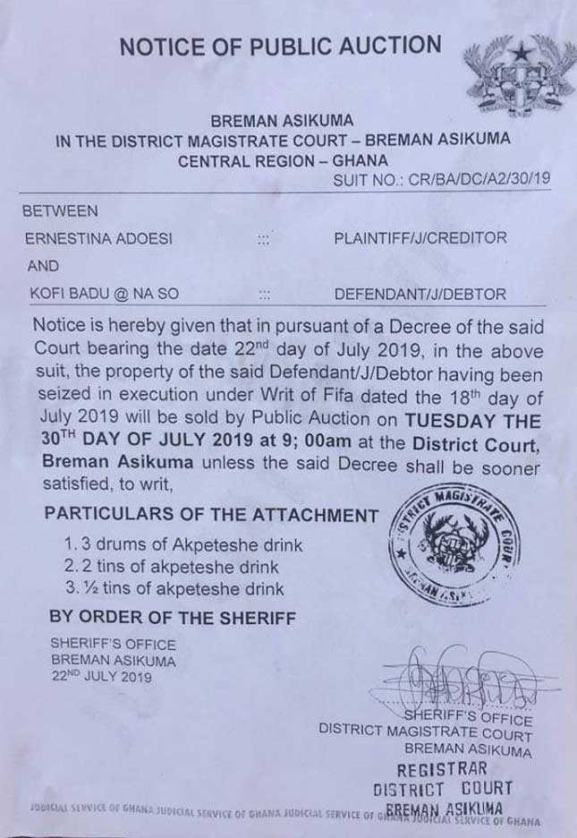 The news? The Breman Asikuma District Magistrate Court located in the Central Region of Ghana, has issued out a final date for the auctioning and sale of drums of the local dry gin, ‘Akpeteshie’ which belong to one Kofi Badu in order to defray his debt.