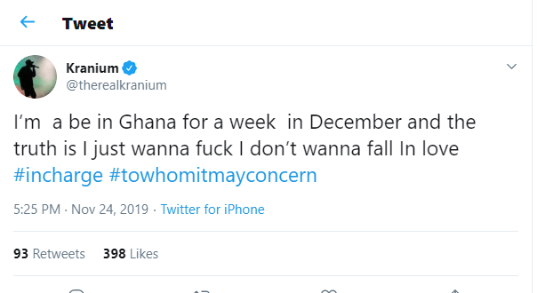 ” I’m a be in Ghana for a week in December and the truth is I just wanna fù⊂k I don’t wanna fall In love #incharge#towhomitmayconcern “