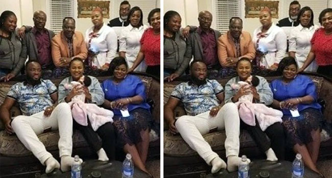 And the second photo shows her husband, Maxwell Mensah sitting close to her, and standing behind them are some well-wishers and family members.