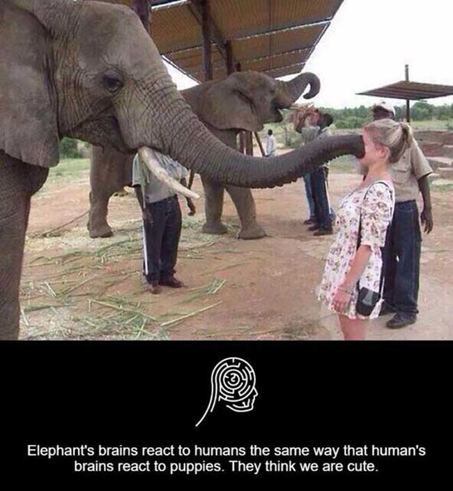 2. Elephants’ brains react to humans the same way that humans’ brains react to puppies. They think we are cute.