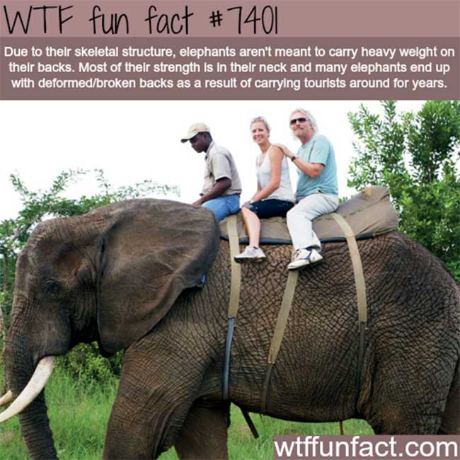 7. Due to their skeletal structure, Elephants aren’t meant to carry heavy weight on their backs. Most of their strength is in their neck and many elephants end up with deformed / broken backs as a result of carrying tourists around for years.