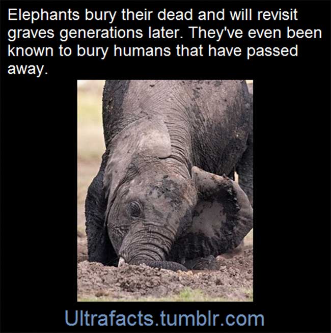 8. Elephants bury their dead and will revisit graves generations later. They have even been known to bury humans that have passed away.