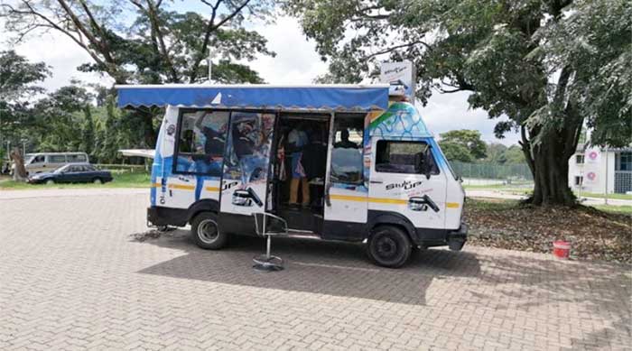 Photos: Man breaks the internet by setting up his barbering shop in a mobile trotro to woo customers