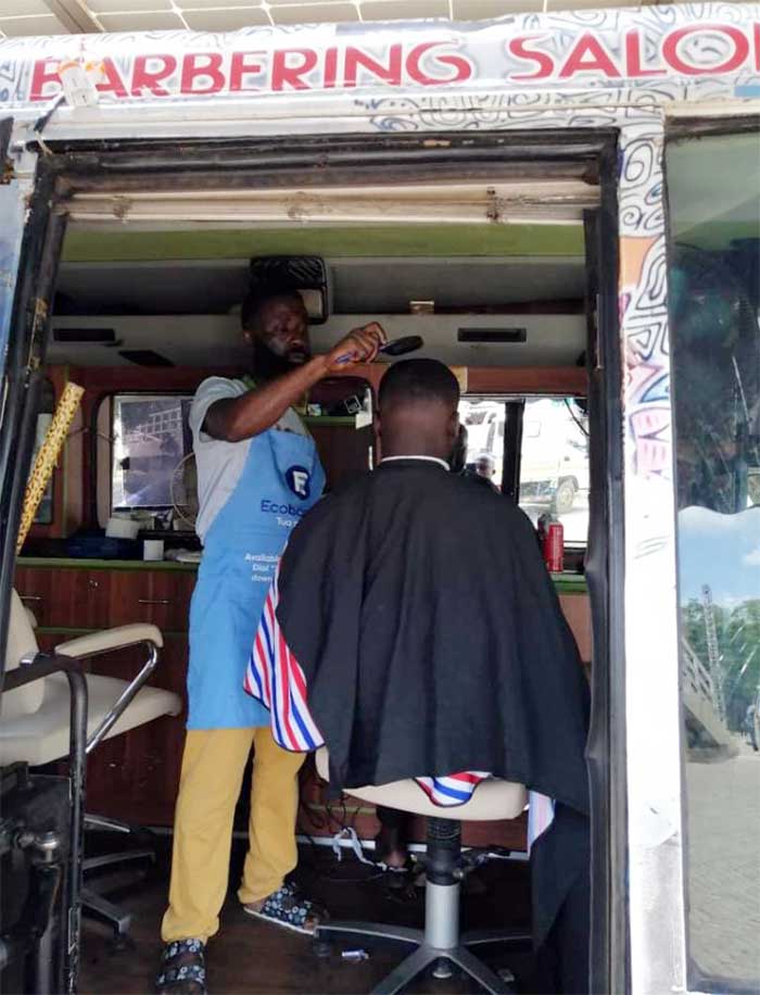 And he charges a cool GHc10 after giving his customers the best of haircuts in his mobile trotro barbering shop.